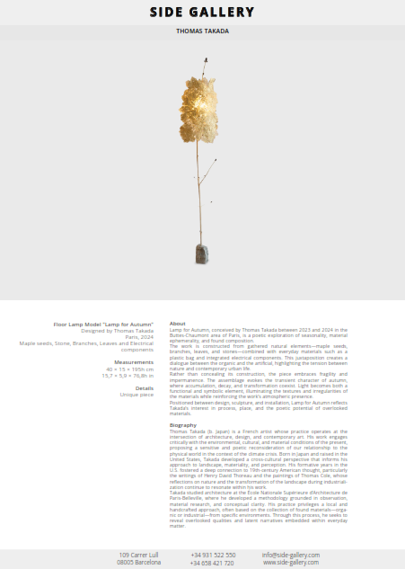 Positioned between design, sculpture, and installation, Lamp for Autumn reflects Takada’s interest in process, place, and the poetic potential of overlooked materials.