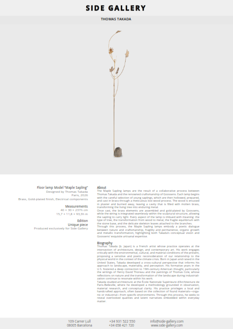 Today, Thomas Takada’s work continues to explore how objects, spaces, and materials can embody a renewed sensitivity to the environment. Situated between art, design, and architecture, his practice invites a slower, more attentive way of seeing—one that reconsiders the essential and opens new perspectives on the world we inhabit.