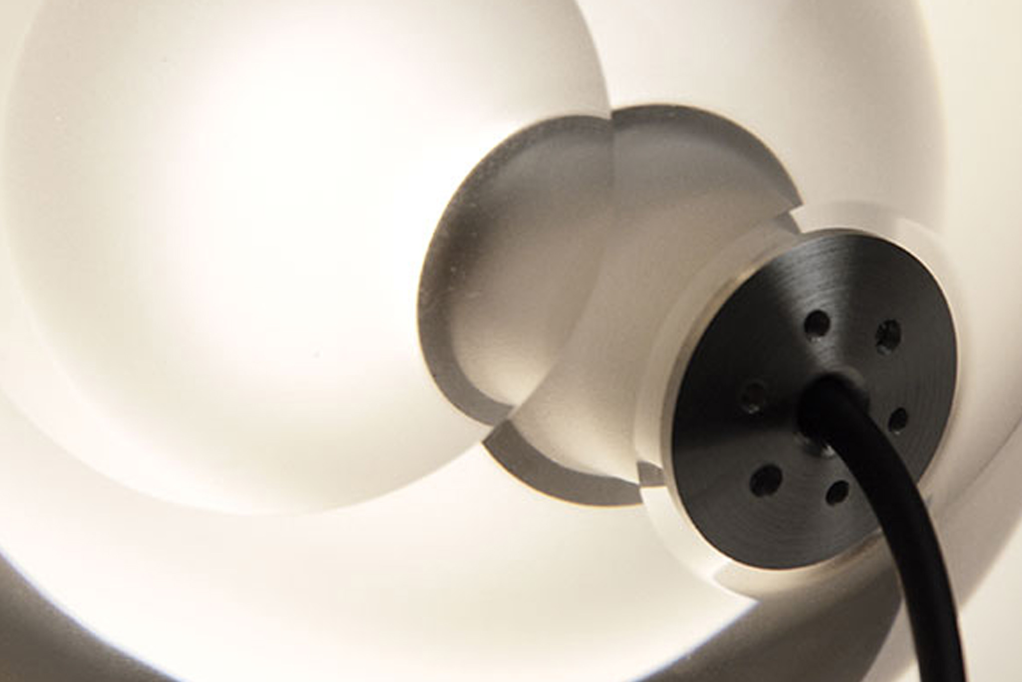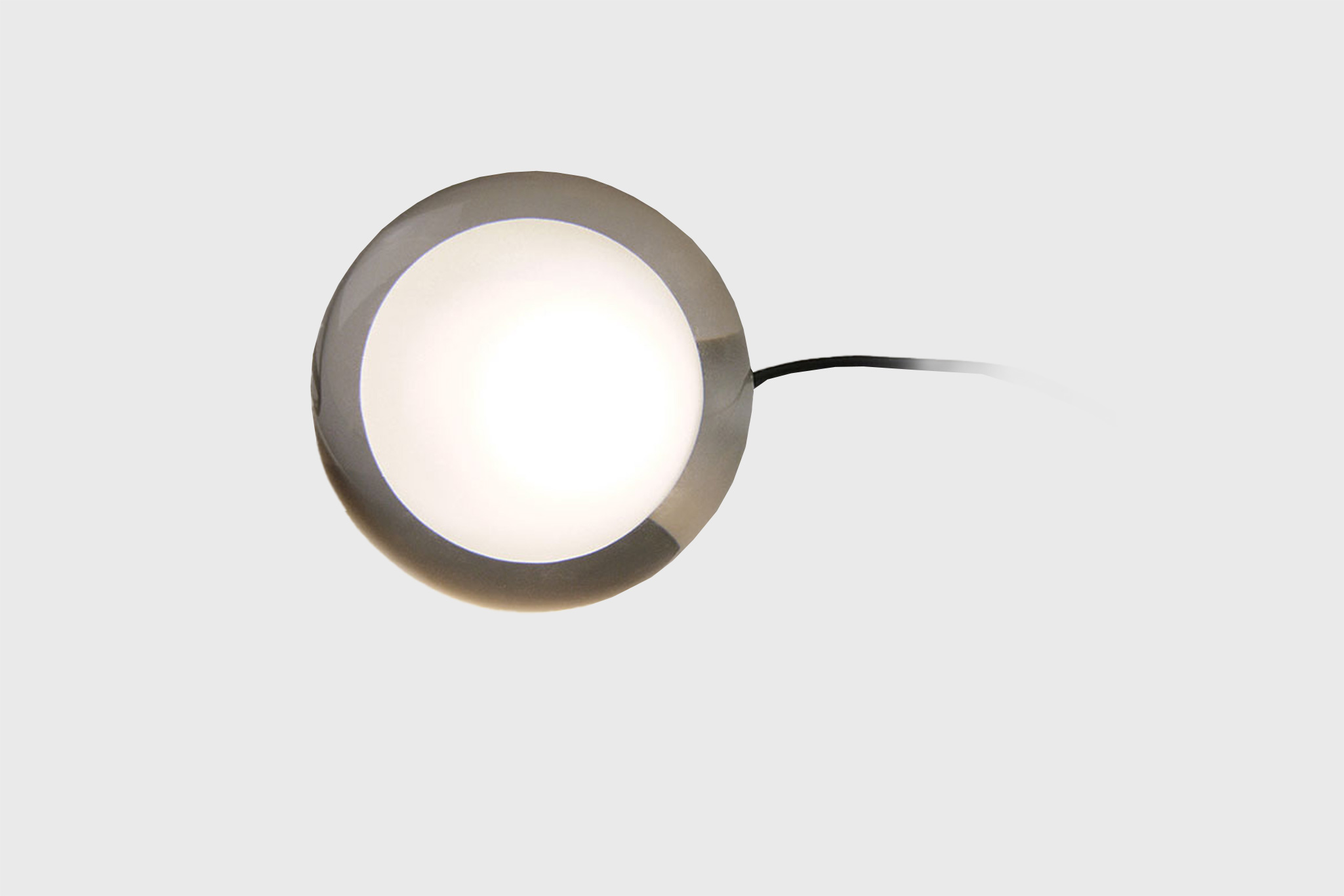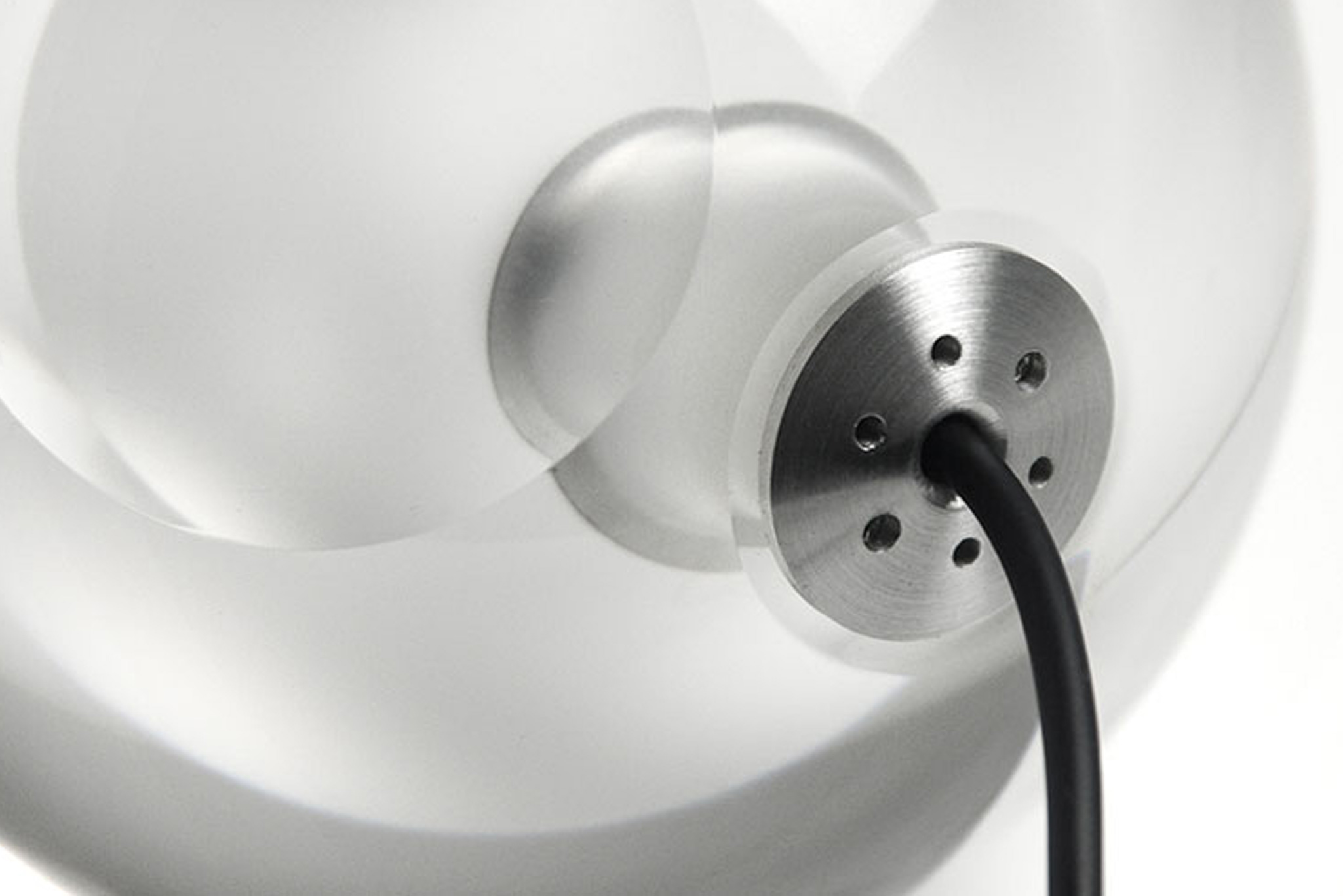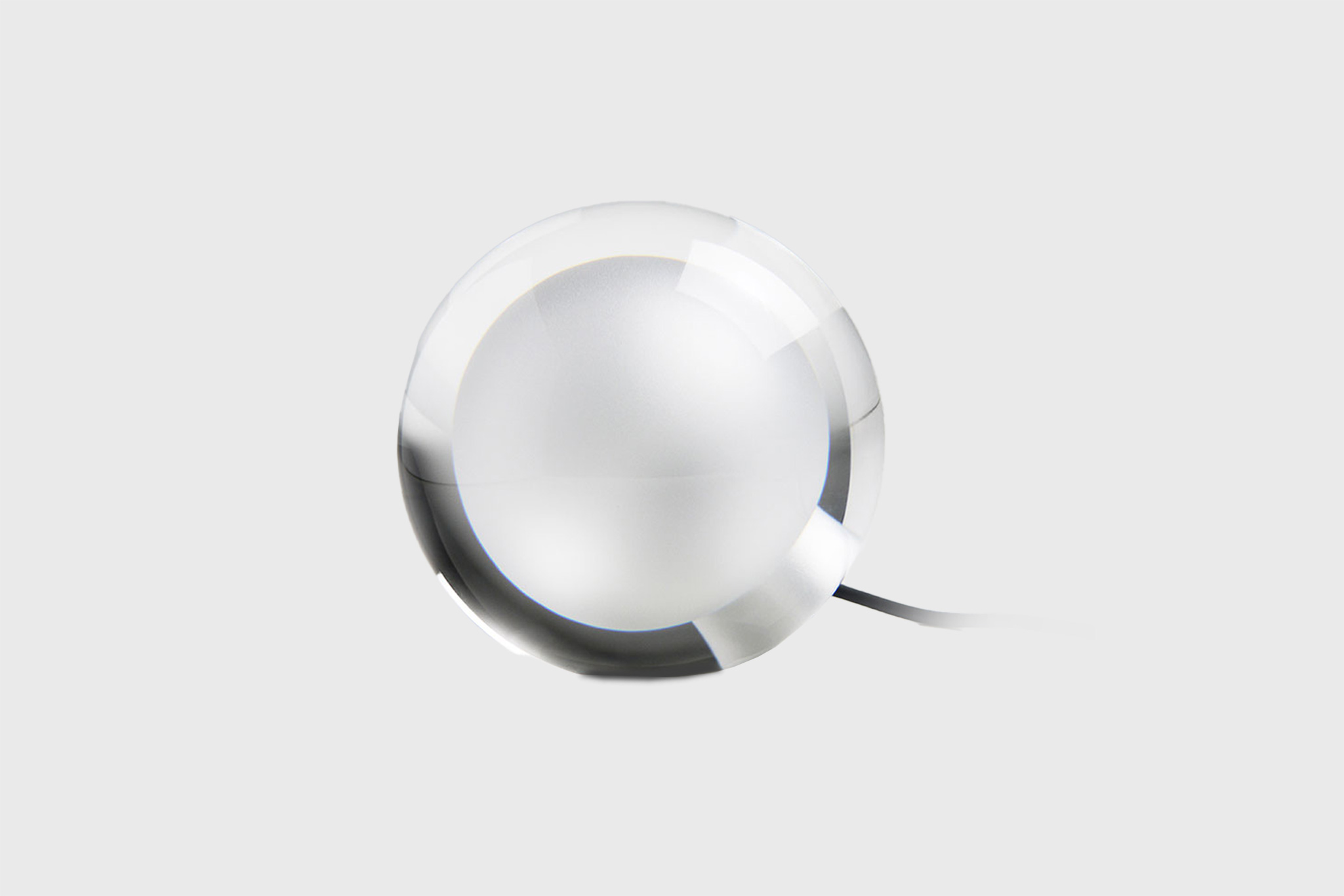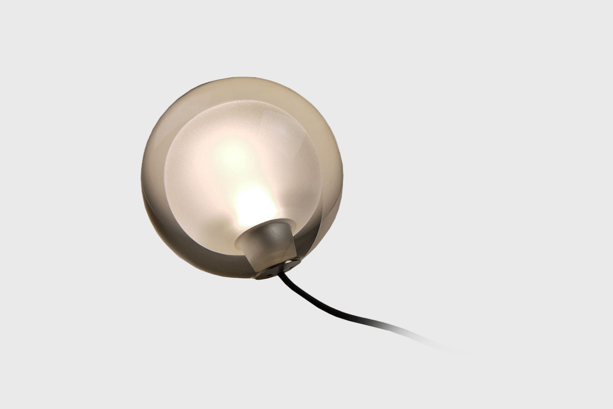 This version is a scaled-down, LED-powered re-edition of his original halogen model (now discontinued). A thick, meticulously polished glass sphere encloses the light source, which appears to float, as if suspended within a drop of water. The frosted interior diffuses the light softly, creating an ethereal glow.