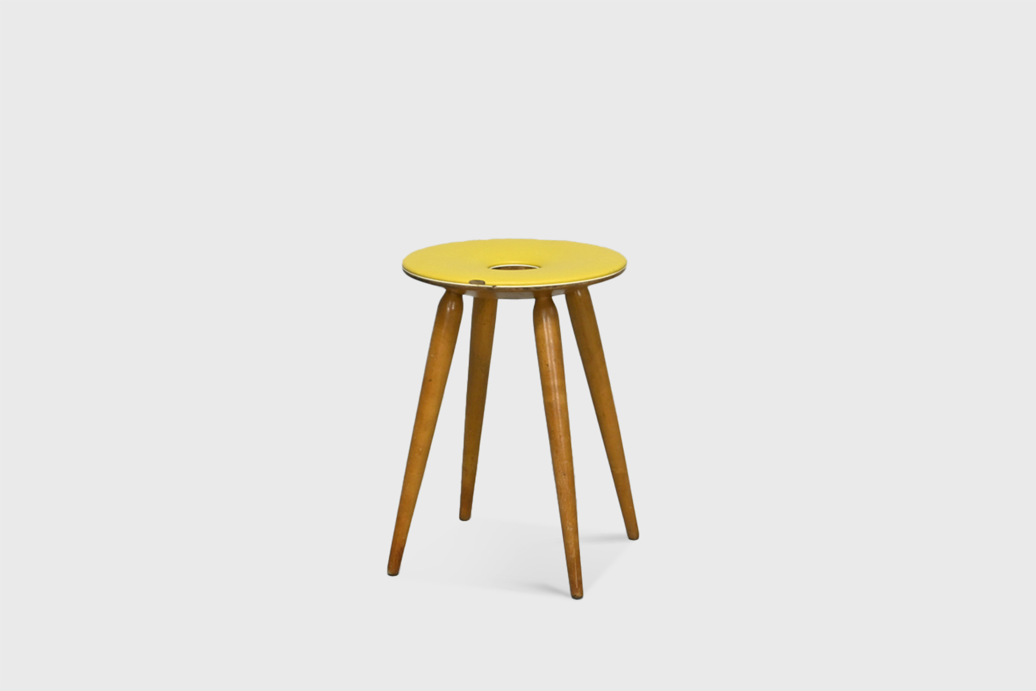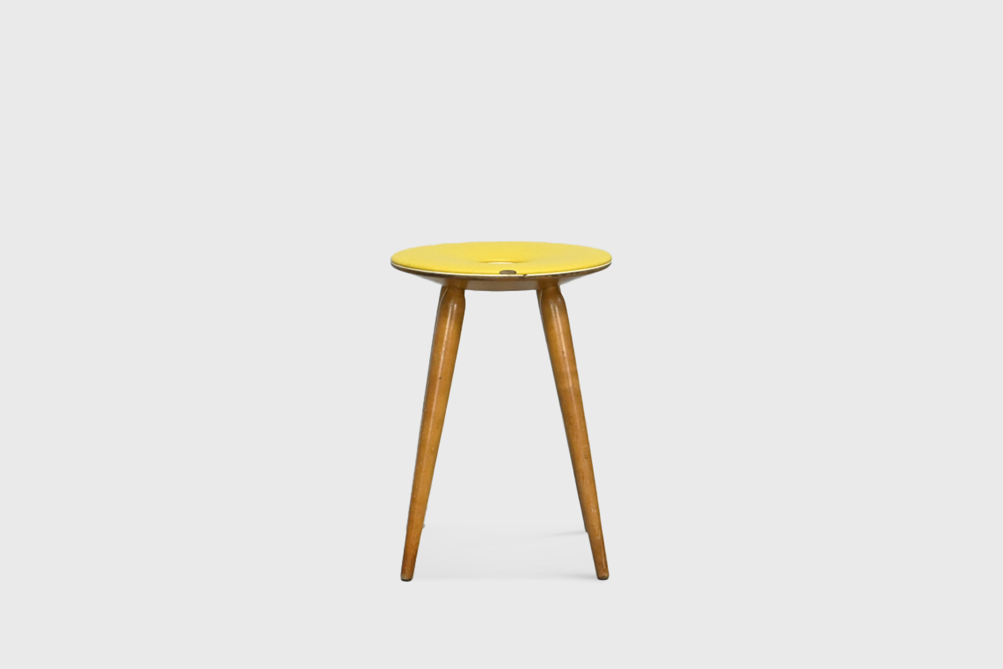 Designed in 1955, the Ring Stool epitomizes Tokukichi Kato’s refined approach to form and structure. Its circular seat—formed from laminated plywood—rests lightly on four tapering legs, achieving both strength and visual delicacy. The stool’s continuous curves reveal the mastery of bentwood construction for which Tendo Mokko became renowned.