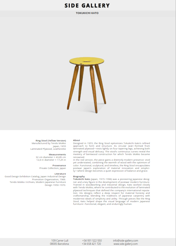 Tokukichi Kato (Japan, 1915–1996) was a pioneering Japanese designer and a key figure in the development of postwar modern furniture. Trained in woodworking and industrial design, Kato worked closely with Tendo Mokko, where he contributed to the evolution of laminated plywood techniques that defined the company’s international reputation. His designs reflect a deep respect for material honesty and craftsmanship, blending the traditions of Japanese carpentry with modernist ideals of simplicity and utility. Through pieces like the Ring Stool, Kato helped shape the visual language of modern Japanese furniture—functional, elegant, and enduringly human.
