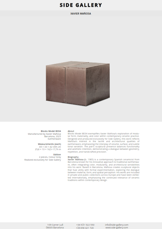 What fundamentally distinguishes Mañosa as a modern-day ceramicist is his boldness when it comes to combining different materials and to exploring new forms of expression. Another question by whichXavier Mañosa has always set great store, from the outset, is the way in which his work is presented, which is obviously a reflection of his training as a designer and the fact that he belongs to the ‘digital generation’. On the one hand, his work stands out as a brand and, on the other, he raises its prominence through his Web site and by participating in numerous exhibitions and promotional events both inside Spain and elsewhere.