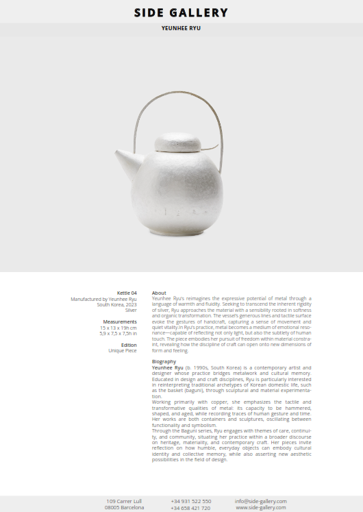 Yeunhee Ryu’s reimagines the expressive potential of metal through a language of warmth and fluidity. Seeking to transcend the inherent rigidity of silver, Ryu approaches the material with a sensibility rooted in softness and organic transformation. The vessel’s generous lines and tactile surface evoke the gestures of handcraft, capturing a sense of movement and quiet vitality.In Ryu’s practice, metal becomes a medium of emotional resonance—capable of reflecting not only light, but also the subtlety of human touch. The piece embodies her pursuit of freedom within material constraint, revealing how the discipline of craft can open onto new dimensions of form and feeling.