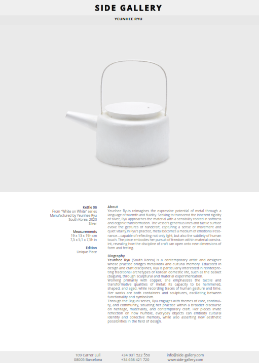 Yeunhee Ryu’s reimagines the expressive potential of metal through a language of warmth and fluidity. Seeking to transcend the inherent rigidity of silver, Ryu approaches the material with a sensibility rooted in softness and organic transformation. The vessel’s generous lines and tactile surface evoke the gestures of handcraft, capturing a sense of movement and quiet vitality.In Ryu’s practice, metal becomes a medium of emotional resonance—capable of reflecting not only light, but also the subtlety of human touch. The piece embodies her pursuit of freedom within material constraint, revealing how the discipline of craft can open onto new dimensions of form and feeling.