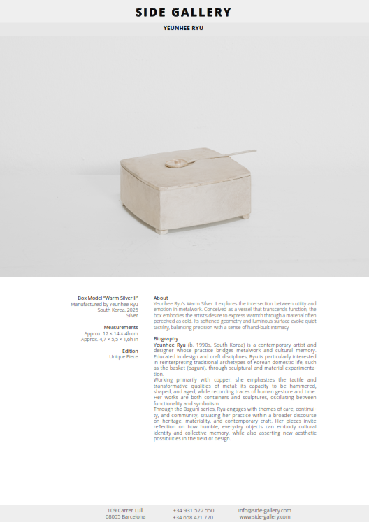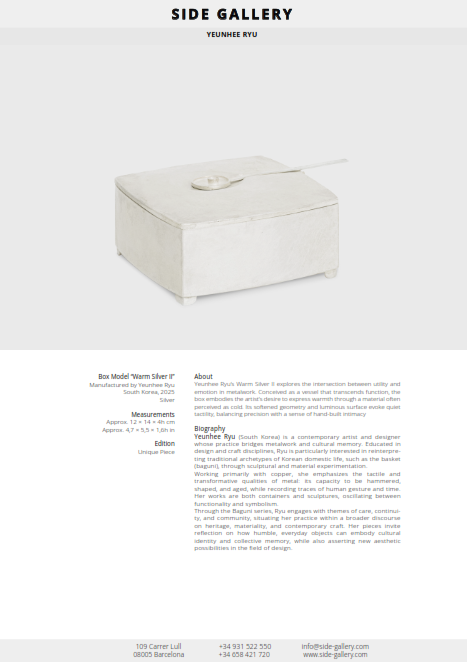 Yeunhee Ryu’s Warm Silver II explores the intersection between utility and emotion in metalwork. Conceived as a vessel that transcends function, the box embodies the artist’s desire to express warmth through a material often perceived as cold. Its softened geometry and luminous surface evoke quiet tactility, balancing precision with a sense of hand-built intimacy