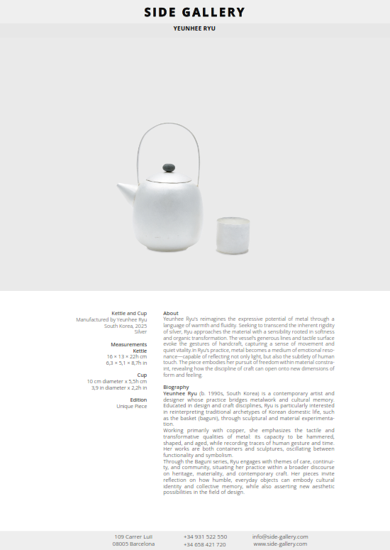 Yeunhee Ryu’s reimagines the expressive potential of metal through a language of warmth and fluidity. Seeking to transcend the inherent rigidity of silver, Ryu approaches the material with a sensibility rooted in softness and organic transformation. The vessel’s generous lines and tactile surface evoke the gestures of handcraft, capturing a sense of movement and quiet vitality.In Ryu’s practice, metal becomes a medium of emotional resonance—capable of reflecting not only light, but also the subtlety of human touch. The piece embodies her pursuit of freedom within material constraint, revealing how the discipline of craft can open onto new dimensions of form and feeling.