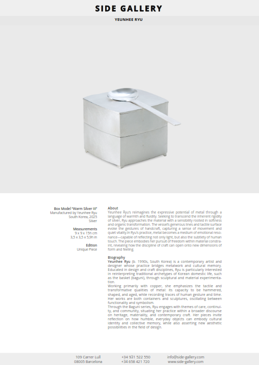Yeunhee Ryu’s reimagines the expressive potential of metal through a language of warmth and fluidity. Seeking to transcend the inherent rigidity of silver, Ryu approaches the material with a sensibility rooted in softness and organic transformation. The vessel’s generous lines and tactile surface evoke the gestures of handcraft, capturing a sense of movement and quiet vitality.In Ryu’s practice, metal becomes a medium of emotional resonance—capable of reflecting not only light, but also the subtlety of human touch. The piece embodies her pursuit of freedom within material constraint, revealing how the discipline of craft can open onto new dimensions of form and feeling.