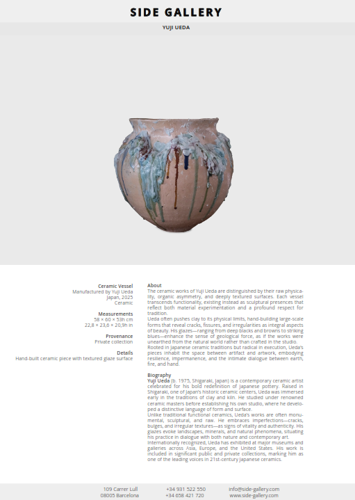 Rooted in Japanese ceramic traditions but radical in execution, Ueda’s pieces inhabit the space between artifact and artwork, embodying resilience, impermanence, and the intimate dialogue between earth, fire, and hand.