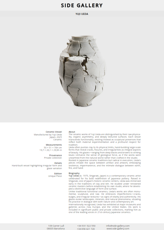 Rooted in Japanese ceramic traditions but radical in execution, Ueda’s pieces inhabit the space between artifact and artwork, embodying resilience, impermanence, and the intimate dialogue between earth, fire, and hand.