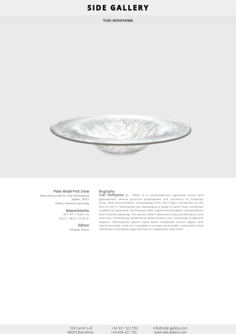 Yuki Nishiyama (b. 1988) is a contemporary Japanese artist and glassworker whose practice emphasizes the harmony of material, form, and environment. Graduating from the Tokyo University of the Arts in 2012, Nishiyama has developed a body of work that combines traditional Japanese techniques with experimental glass manipulation and enamel painting. His pieces often reference natural elements and seasons, translating ephemeral phenomena into enduring sculptural objects. Nishiyama’s works have been exhibited across Japan and internationally, and are included in private and public collections that celebrate innovative approaches to materiality and form.