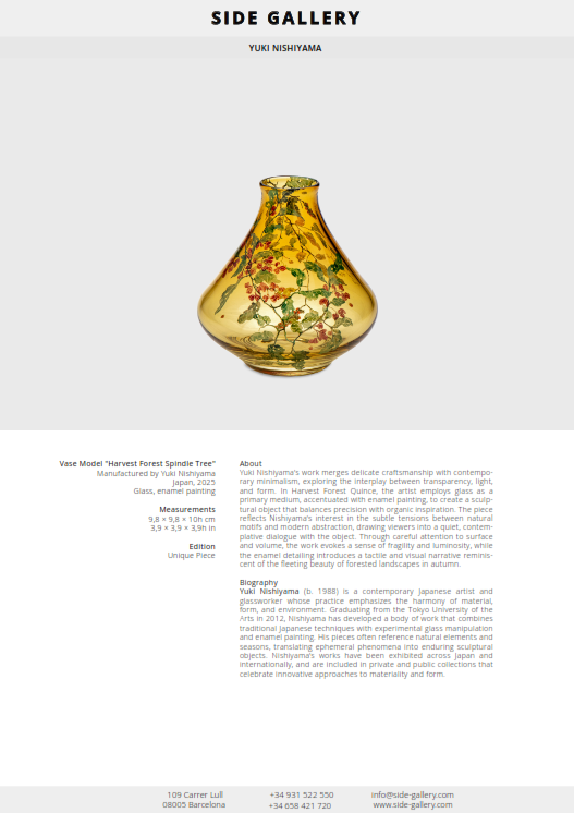 Yuki Nishiyama (b. 1988) is a contemporary Japanese artist specializing in glasswork and enamel painting. Graduating from Tokyo University of the Arts in 2012, he blends traditional Japanese techniques with experimental glass manipulation to create sculptural forms inspired by natural elements. His works explore the intersection of material, form, and light, often referencing seasonal phenomena and botanical motifs. Nishiyama’s pieces are exhibited in Japan and internationally, and are included in public and private collections emphasizing innovative contemporary craft.