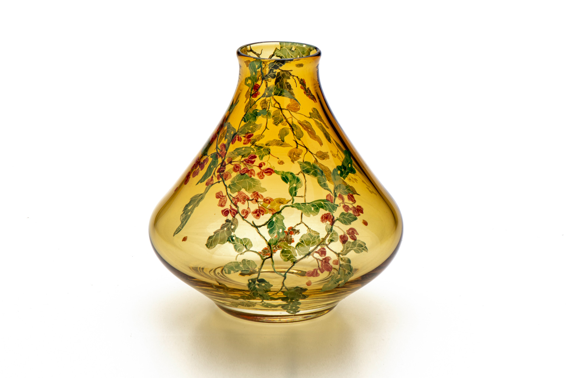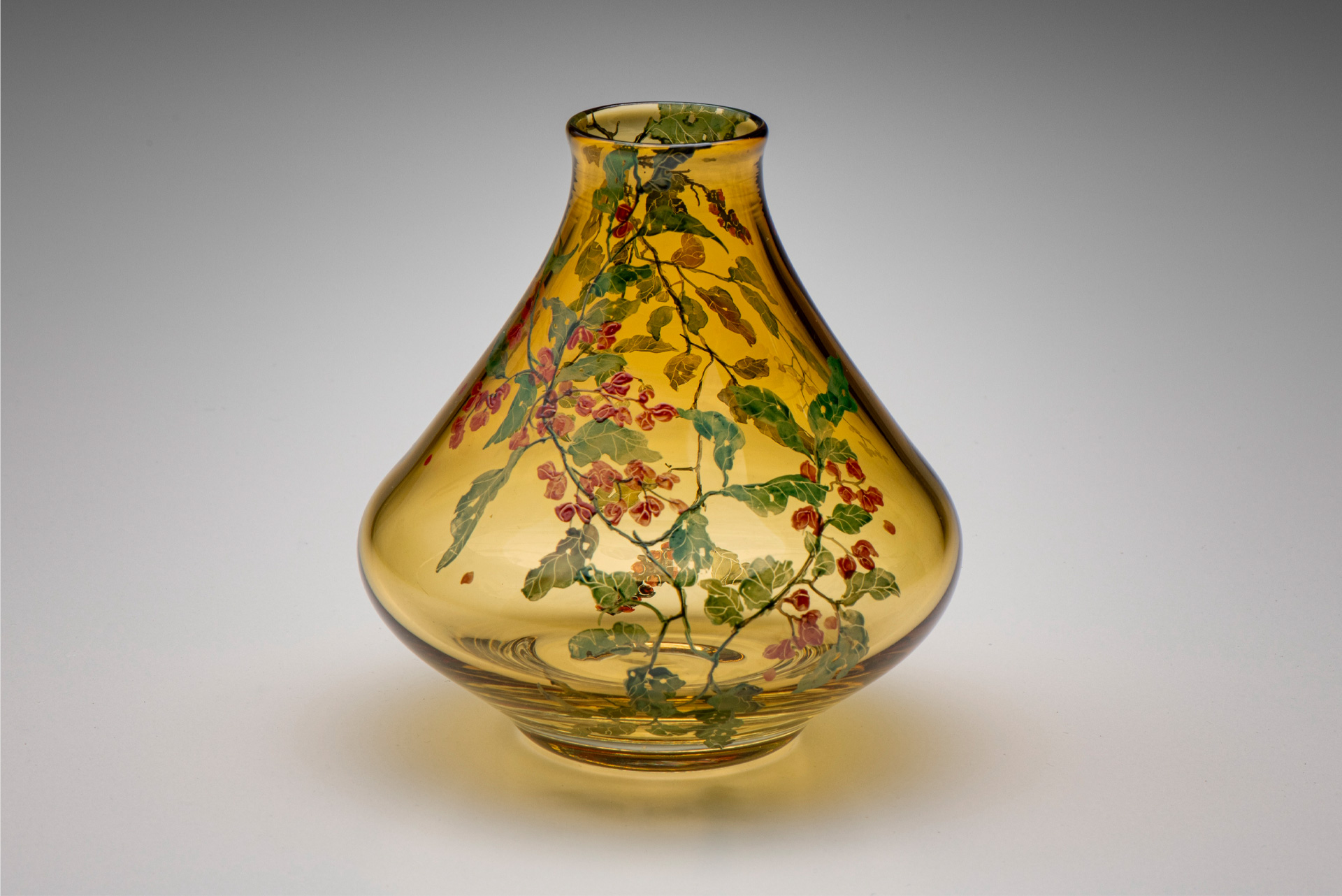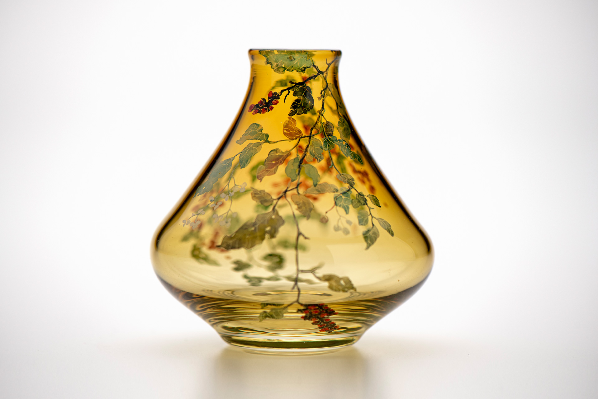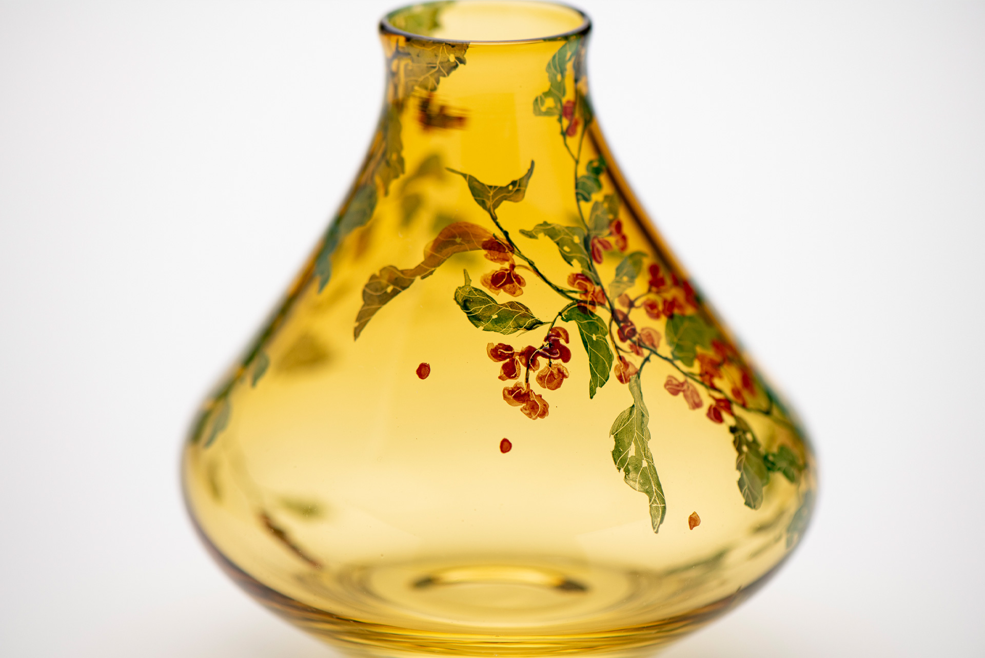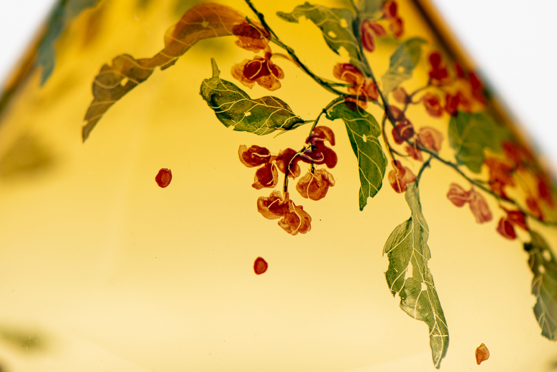 In Harvest Forest Spindle Tree, Yuki Nishiyama continues his exploration of translucency, texture, and natural motifs. The work employs glass as a medium with enamel painting to create a delicate, luminous object that captures the quiet beauty of arboreal forms. Nishiyama’s sculptural approach highlights the interplay between solid and light, fragility and presence, evoking the subtle intricacies of forest flora. The piece invites a contemplative engagement, where the viewer can appreciate the nuanced surfaces, refined color, and organic inspiration inherent to his practice.